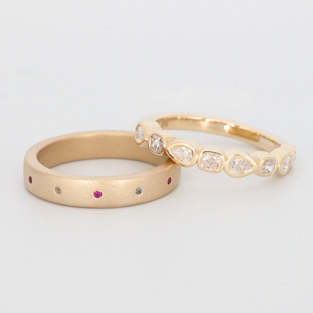 Sam and Grace designed their wedding bands to incorporate stones that were meaningful to their relationship. We flush set the stones in the front of Sam's ring and in the back of Grace's ring.