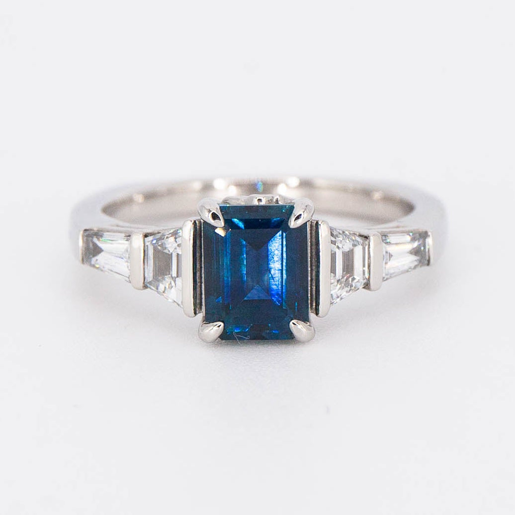Hayley grew up in Montana and knew she wanted a Montana sapphire for the center of her engagement ring. Accented with lab diamonds and hidden personal details, including paw prings and mountains, this ring was customized from head to toe.
